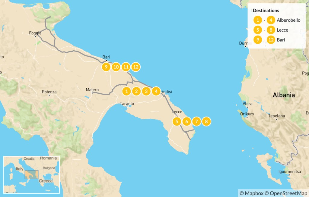 Map of Laidback Puglia: Alberobello, Lecce, Bari – 13 Days