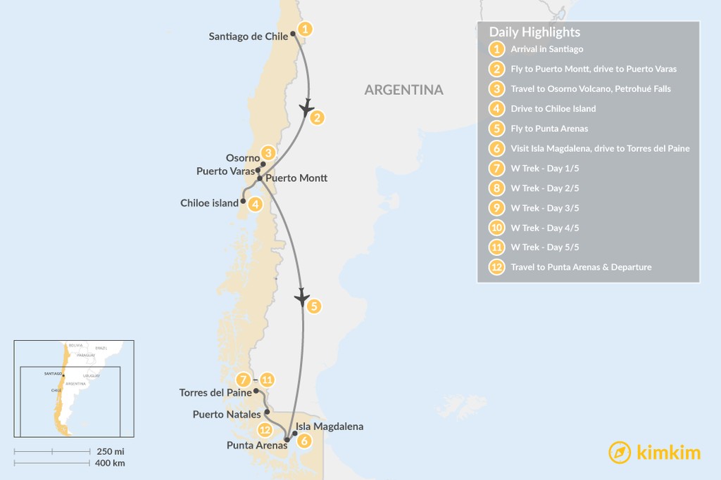 This extensive 12-day itinerary covers the major highlights of central and southern Chile: the Lake District and Torres del Paine National Park. The Lake District is justifiably famous for its charming villages, Prussian-blue lakes, and snowcapped volcanoes. Torres del Paine, on the other hand, is the crown jewel of national parks in Patagonia, and here, you’ll embark on a multiday hike known as the W Trek. Throw in a visit to a Patagonian penguin colony and a jaunt to the mystical and beautiful island of Chiloé, and you have the perfect recipe for the trip of a lifetime.