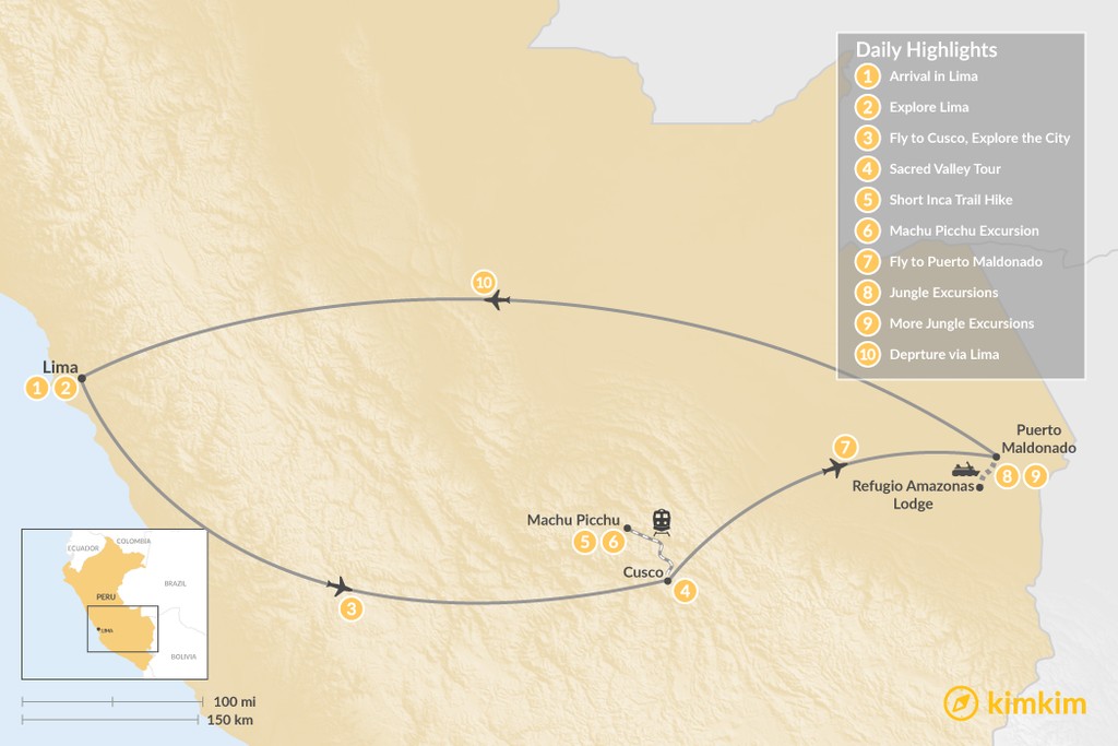 Map of Lima, Machu Picchu & Amazon Jungle – 10 Days