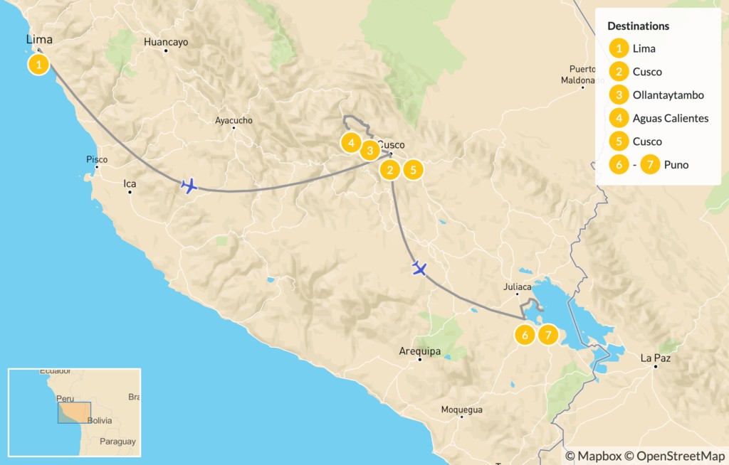 Map of Lima, Machu Picchu & Lake Titicaca – 8 Days