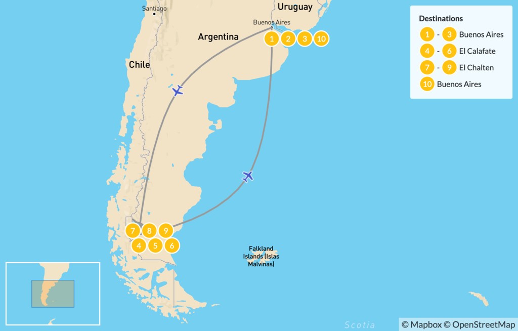 Map of Los Glaciares & Fitz Roy – 10 Days