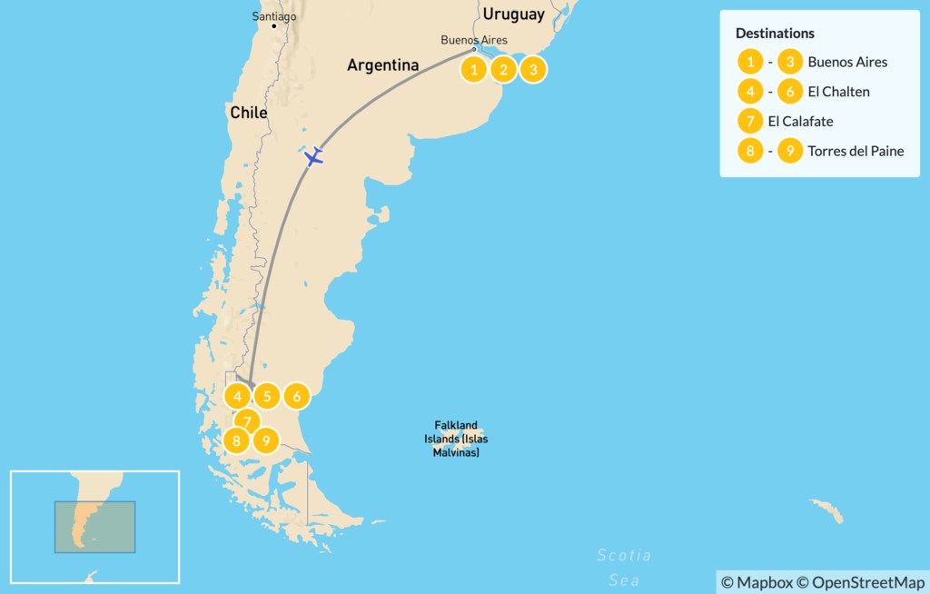 Map of Los Glaciares & Torres del Paine – 10 Days
