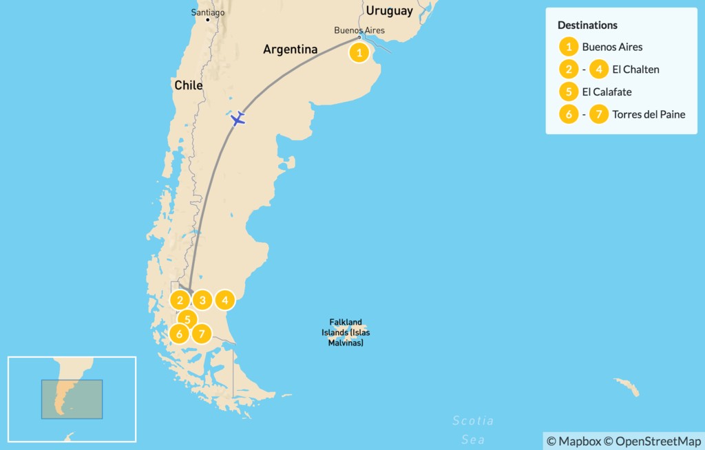 Map of Los Glaciares & Torres del Paine – 8 Days