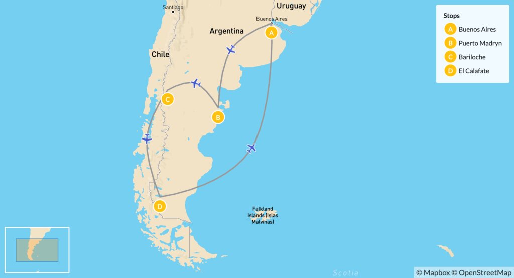 Map of Luxury Active Tour & Wildlife Viewing in Argentina – 14 Days