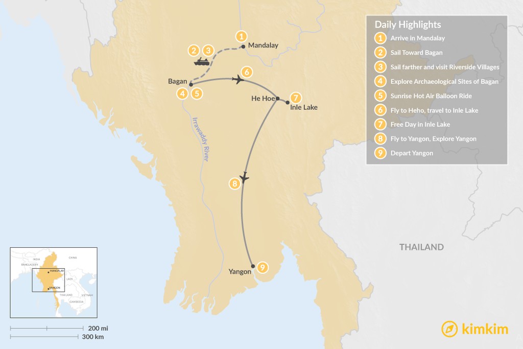 Map of Luxury & Adventure in Myanmar – 9 Days