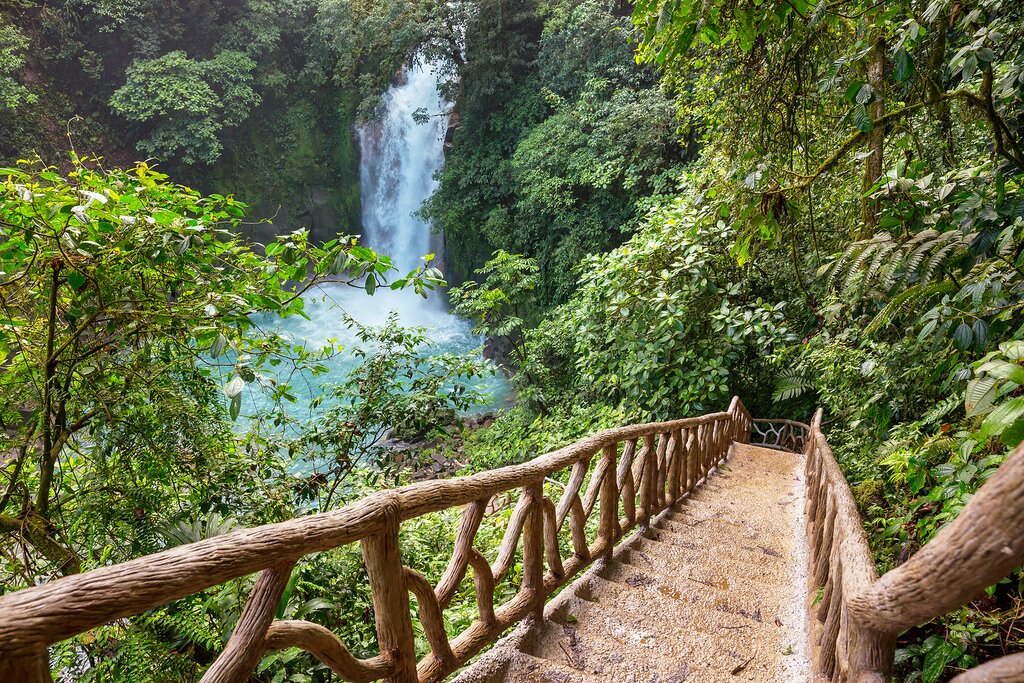 The hike covers four miles (seven km) along the river through a rainforest ecosystem home to exotic animals like monkeys, sloths, peccaries, and anteaters. You’ll even pass by the specific point where two streams merge and produce the reaction in the minerals that give the Celeste its exotic color. The hike culminates with a descent of 253 steps to reach the Catarata Río Celeste, a waterfall of such profound beauty you’ll think you’ve found your own private Eden.