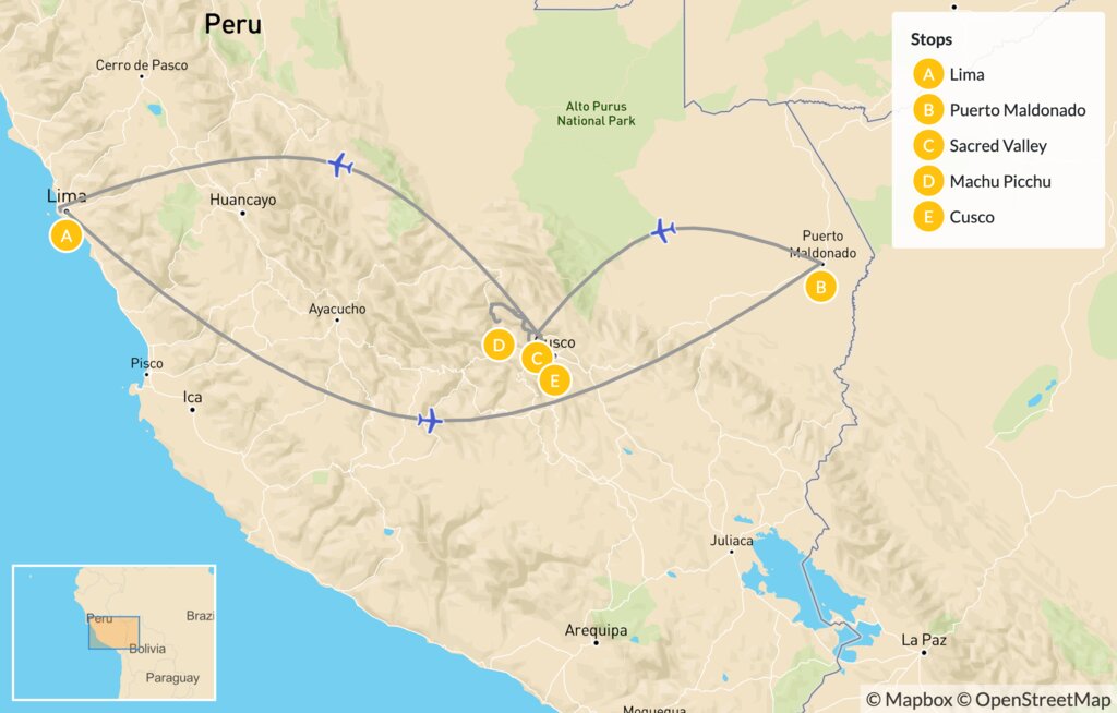 Map of Luxury Amazon Jungle & Machu Picchu Adventure – 10 Days