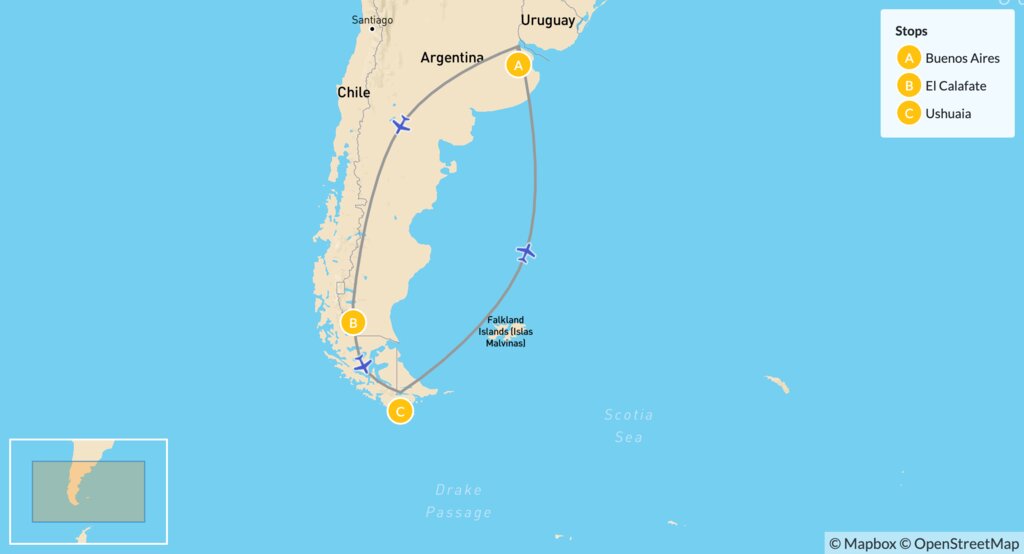 Map of Luxury Argentine Patagonia Explorer: Buenos Aires, El Calafate & Ushuaia – 7 Days