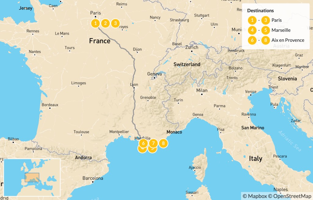 Map of Luxury, Art, & Food in France: Paris & Provence – 9 Days