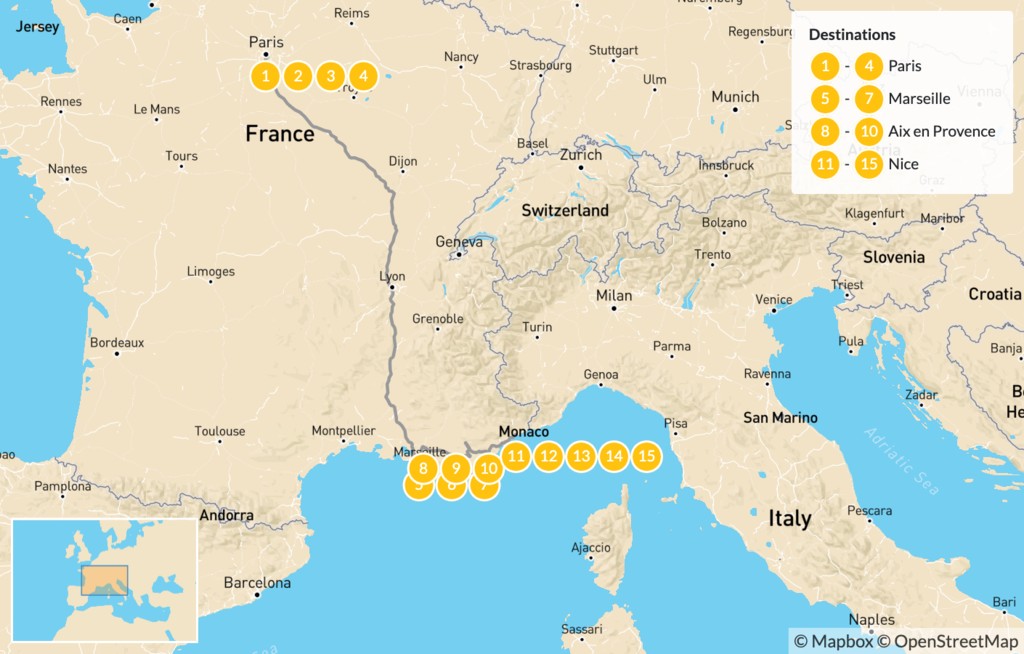 Map of Luxury, Art, & Food in France: Paris, Provence, & the French Riviera – 16 Days