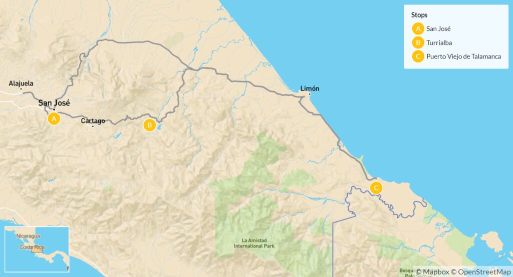 Map of Luxury Costa Rica from Rainforest to Beach: Turrialba & Puerto Viejo de Talamanca – 7 Days
