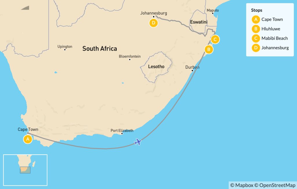Map of Luxury Escape in South Africa: Cape Town to the East Coast – 14 Days