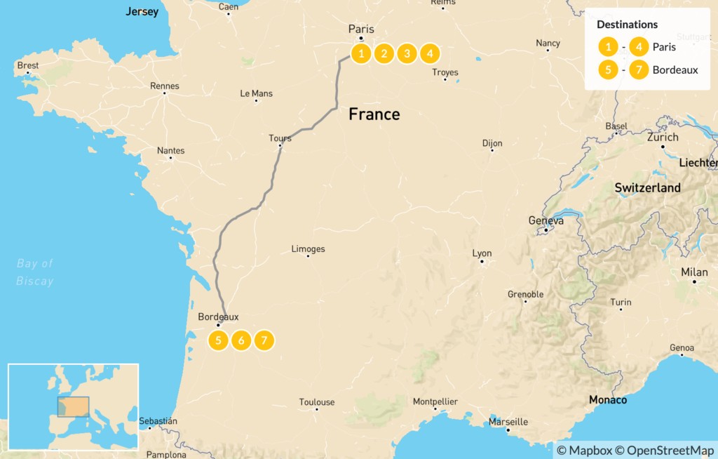 Map of Luxury Food and Wine Tour: Paris & Bordeaux – 8 Days