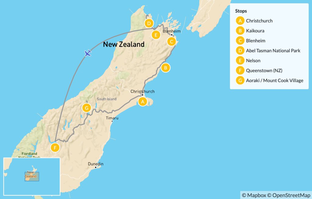 Explore the best of New Zealand’s South Island—with a touch of luxury—on this two-week itinerary filled with adventure, relaxation, nature, and wine. Starting and finishing in Christchurch, you’ll take the scenic Coastal Pacific Train north to reach the famous Marlborough wine region and the golden beaches of Abel Tasman National Park. Then, fly to Queenstown to cruise the glassy waters of Milford Sound / Piopiotahi and explore the glaciers of Aoraki / Mount Cook by helicopter and kayak.