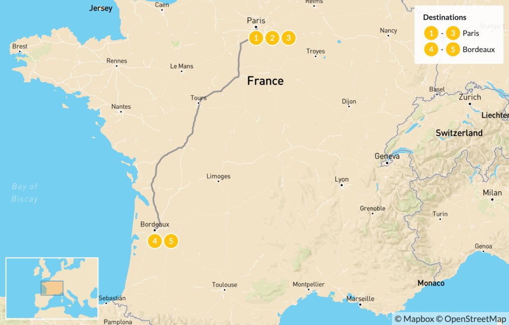 Map of Luxury Food & Wine Tour: Paris & Bordeaux – 6 Days
