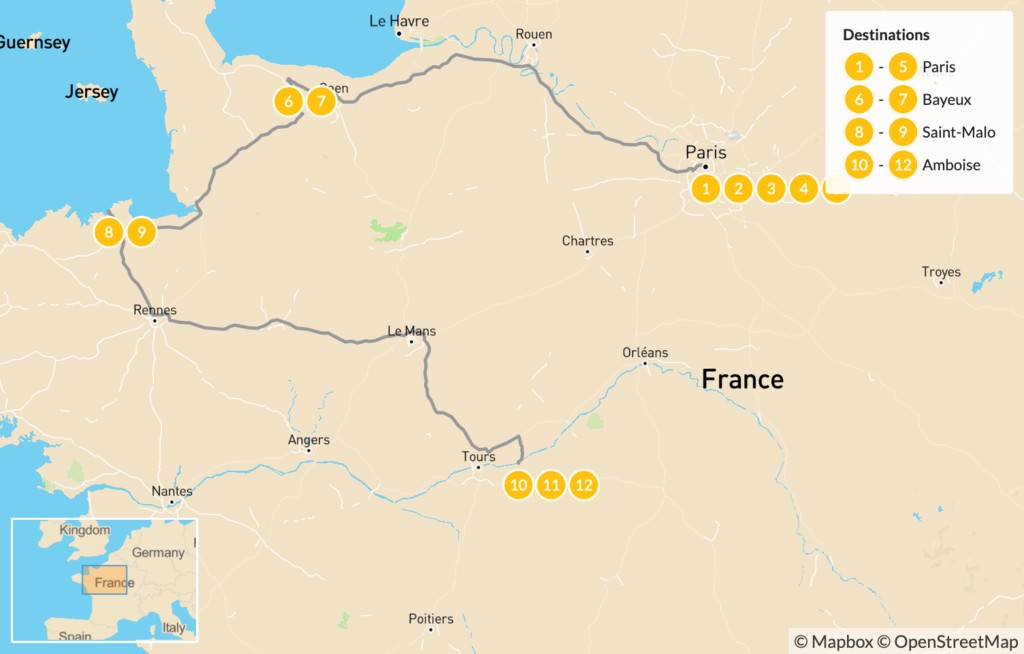 Map of Luxury Getaway to Western France: Paris, Normandy, Brittany, Loire Valley, & More – 13 Days