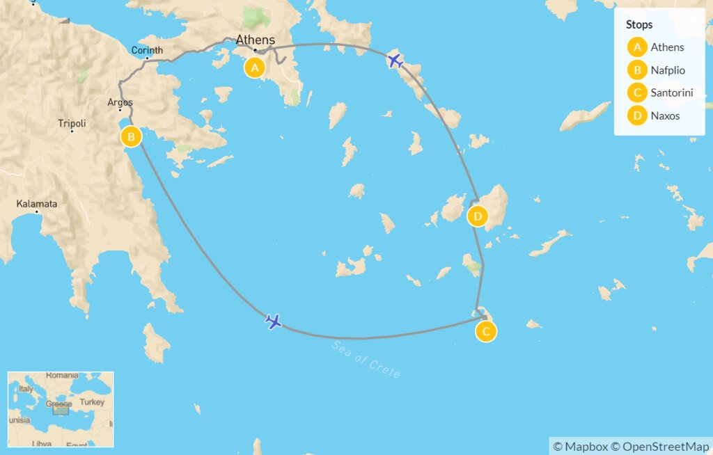 Map of Luxury Greek Gastronomy Tour: Athens, Nafplio, Santorini & Naxos – 10 Days