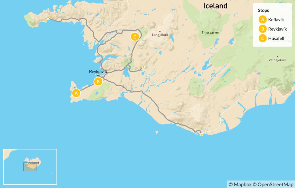 | Day 1 | Arrive in Reykjavík, Þríhnúkagígur Volcano Helicopter Trip, Blue Lagoon Spa | Reykjavík |
