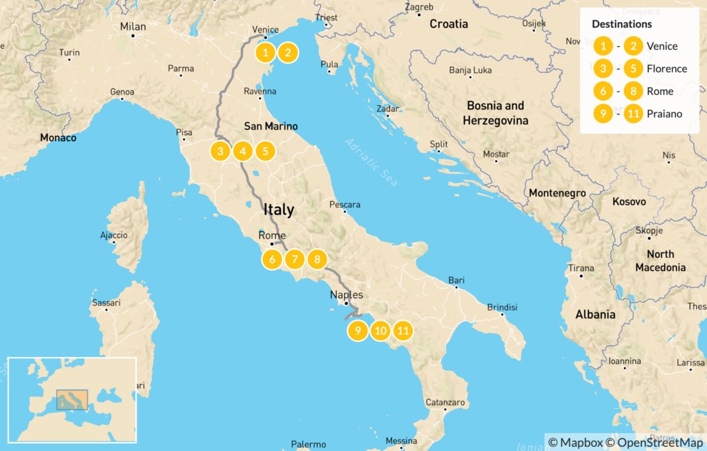 Map of Luxury Italian Highlights: Venice, Florence, Amalfi Coast, Rome, & More – 12 Days
