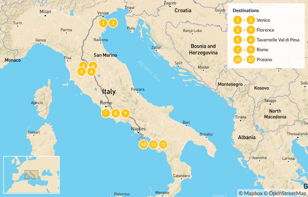 Map of Luxury Italian Highlights: Venice, Florence, Amalfi Coast, Rome, & More – 13 Days