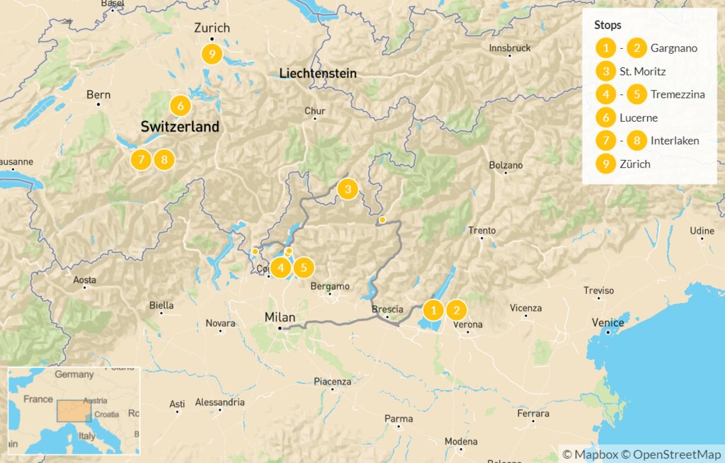 Map of Luxury Italian & Swiss Lakes by Train – 10 Days