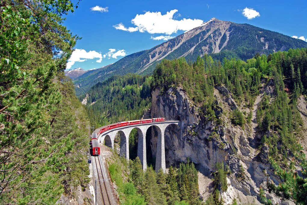 It’s an early start today as you meet your driver for a 3.5-hour transfer to Tirano, a tiny town on the border with Switzerland and boarding point for the Bernina Express. This train line connects Europe from north to south and is heralded for its astonishing scenic routes that pass through the UNESCO World Heritage Site of the Rhaetian Railway, which includes the 213-foot-long (65 m) Landwasser Viaduct.