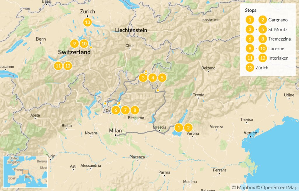 Map of Luxury Italian & Swiss Lakes by Train – 14 Days