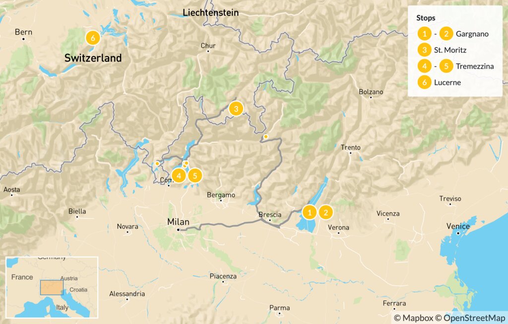 Map of Luxury Italian & Swiss Lakes by Train – 7 Days