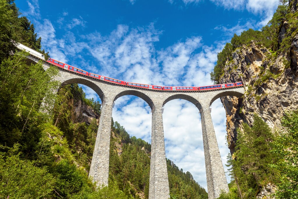 It’s an early start today as you meet your driver for a 3.5-hour transfer to Tirano, a tiny town on the border with Switzerland and boarding point for the Bernina Express. This train line connects Europe from north to south and is heralded for its astonishing scenic routes that pass through the UNESCO World Heritage Site of the Rhaetian Railway, which includes the 213-foot-long (65 m) Landwasser Viaduct.