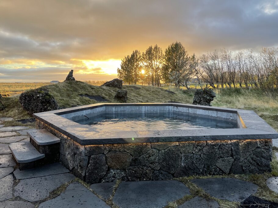 In the afternoon, it’s time to transfer to tonight’s accommodation, Skálakot Manor, a boutique family-run hotel whose grounds include a fourth-generation farm focused on breeding Icelandic horses. While the surrounding countryside covers the vast expanse of the Icelandic Highlands, inside, rooms are tastefully decorated in a fusion of old-world luxury, muted tones, and contemporary Nordic design. Settle in and either saddle up for a guided horseback ride following the Þjórsá River or relax in the bar before your dinner reservation.