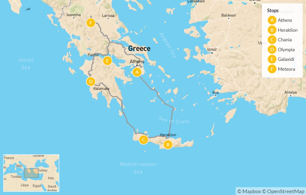 Map of Luxury Journey Through Ancient Greece: Athens, Crete & Peloponnese – 10 Days