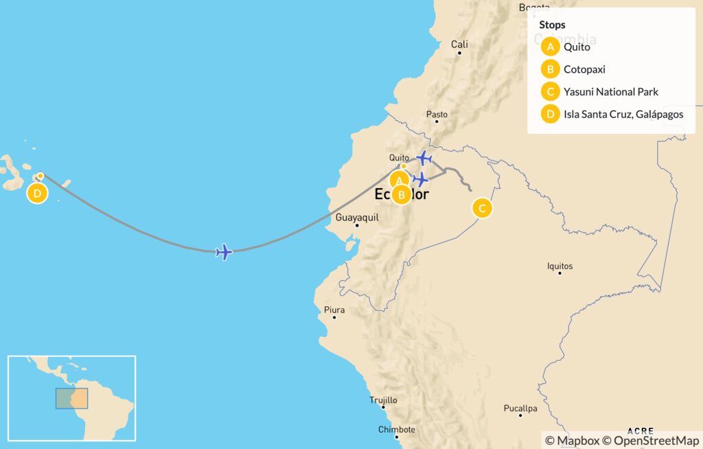 Map of Luxury Journey Through Ecuador & the Galápagos – 14 Days