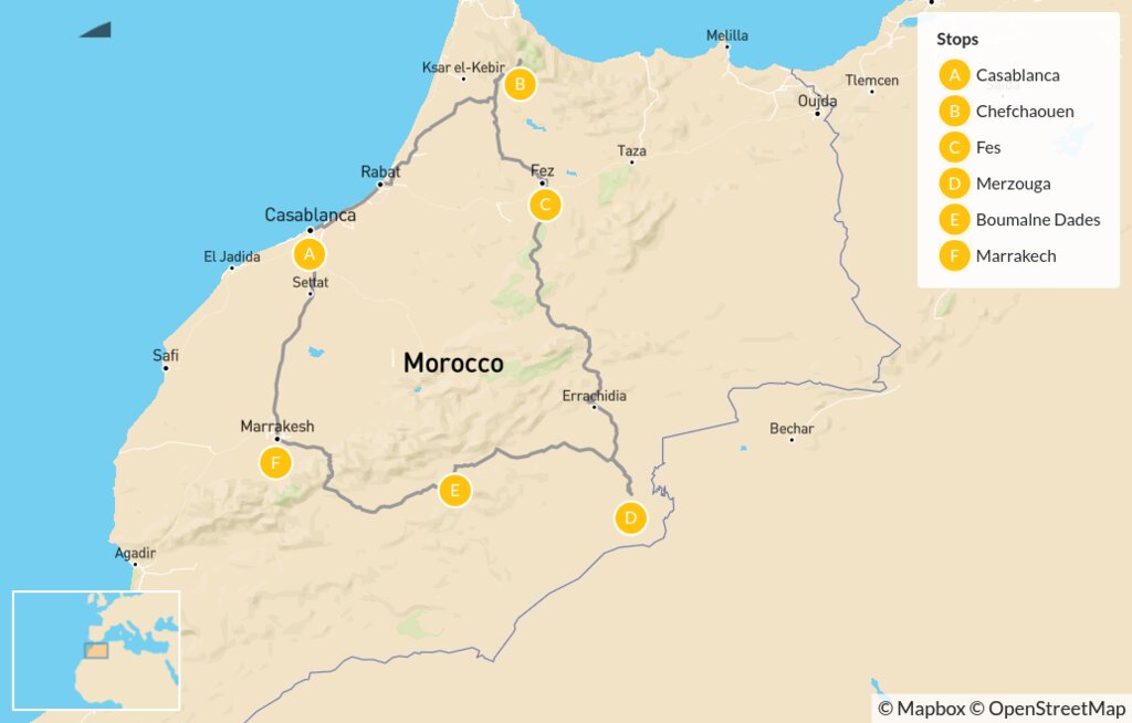 Map of Luxury Morocco: Casablanca to Marrakech via the Desert – 8 Days