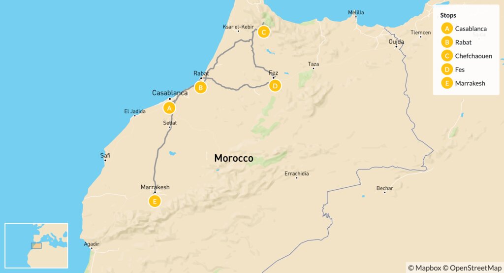 Map of Luxury Morocco Getaway: Rabat, Chefchaouen, Fes & Marrakesh – 7 Days
