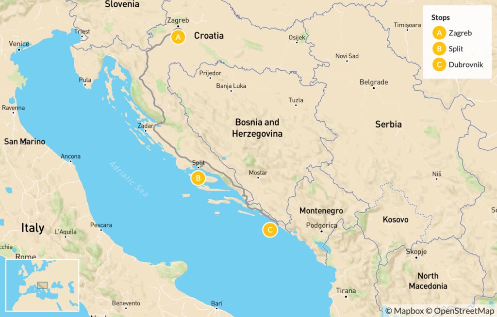 Map of Luxury Nature & Culture in Croatia: Zagreb, Split & Dubrovnik – 7 Days