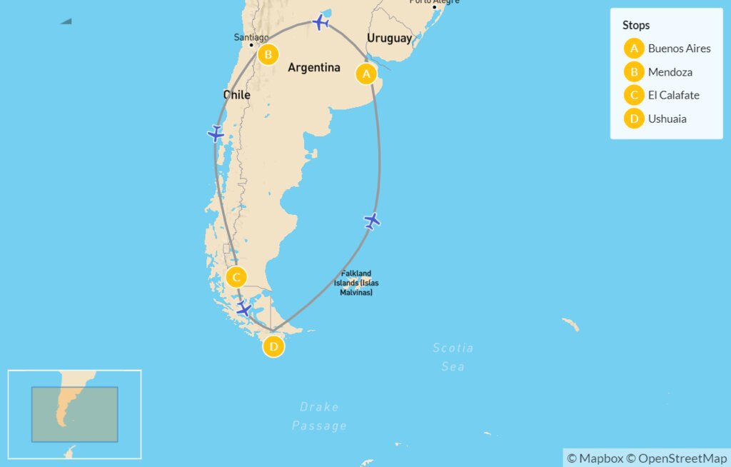 Map of Luxury Nature & Wine Tour in Argentina: Mendoza, El Calafate & Ushuaia – 10 Days