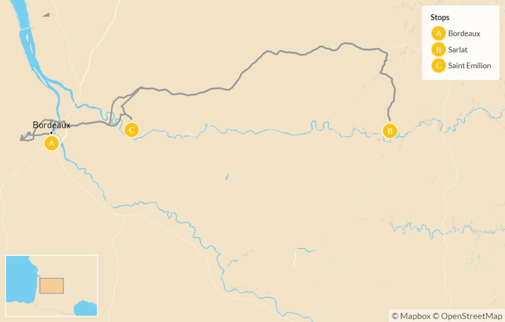 Map of Luxury Road Trip Through Southwestern France: Bordeaux, Sarlat & Saint-Émilion – 10 Days