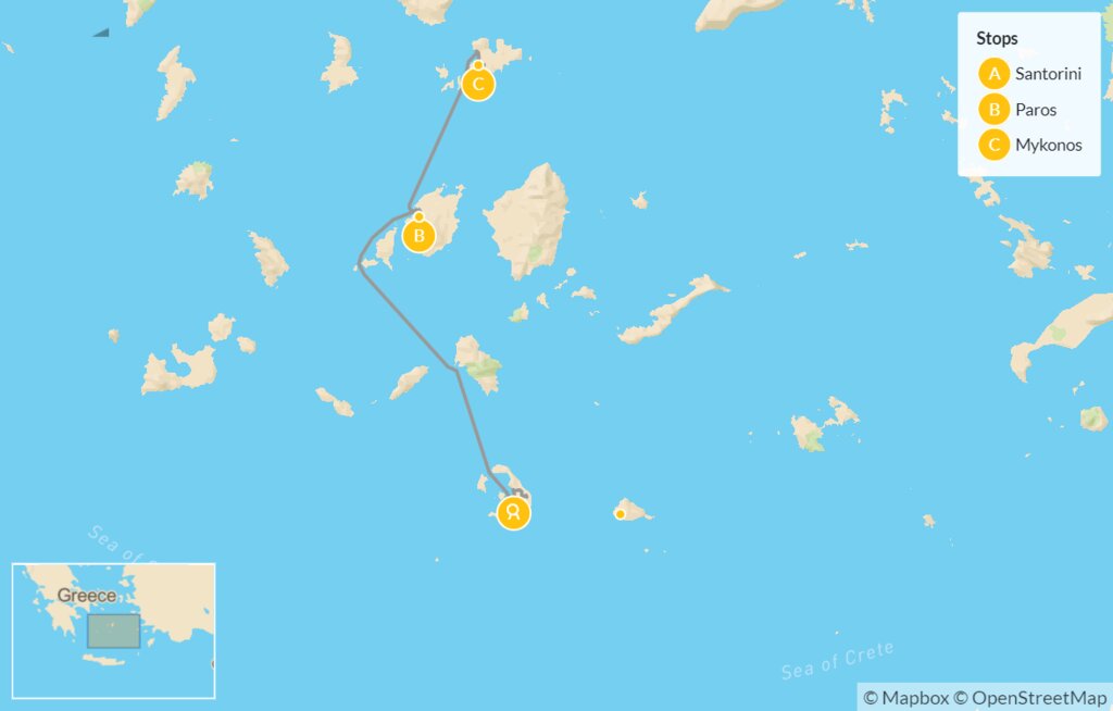 Map of Luxury Sailing in the Cyclades: Santorini, Paros & Mykonos – 7 Days