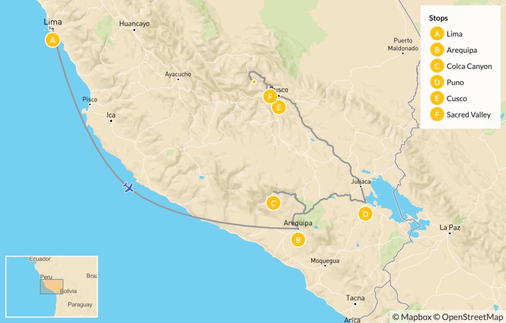 Map of Luxury Southern Peru: Colca Canyon, Lake Titicaca & Machu Picchu – 14 Days