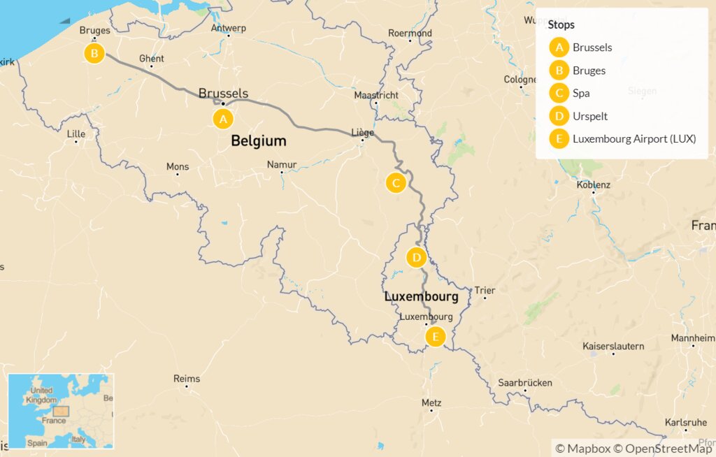 Map of Luxury Tour of Belgium & Luxembourg: Bruges, Brussels, Spa & Urspelt – 14 Days