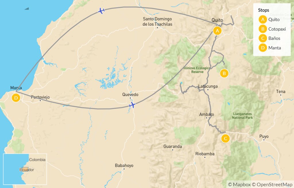 Map of Luxury Tour of Ecuador’s Mountains & Coast – 14 Days