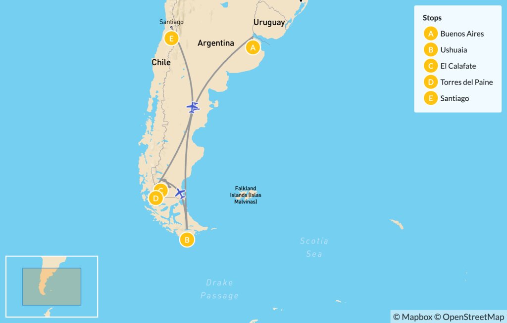 Map of Luxury Tour of Patagonia’s National Parks: From Argentina to Chile – 10 Days