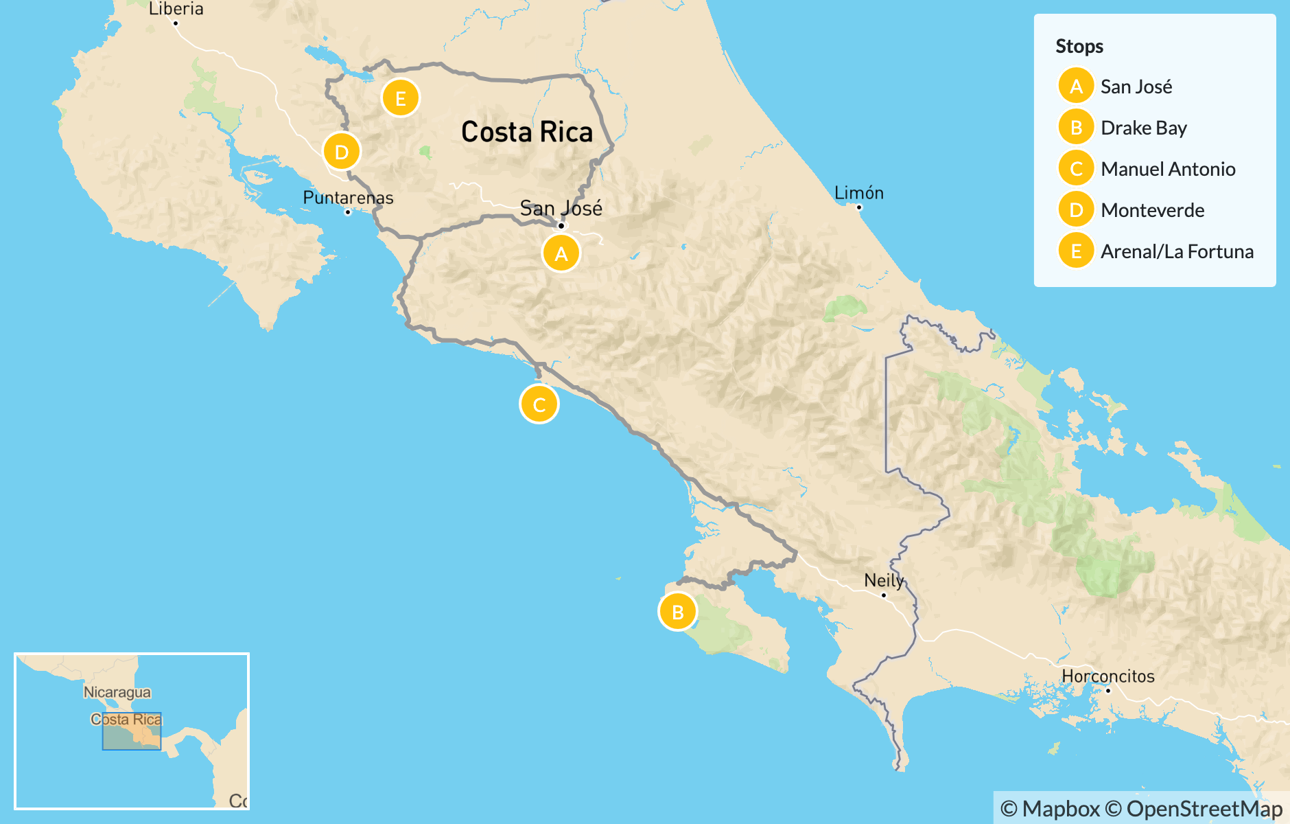 Map of Luxury Trip to Costa Rica’s Beaches, Cloud Forests & Volcanoes – 14 Days