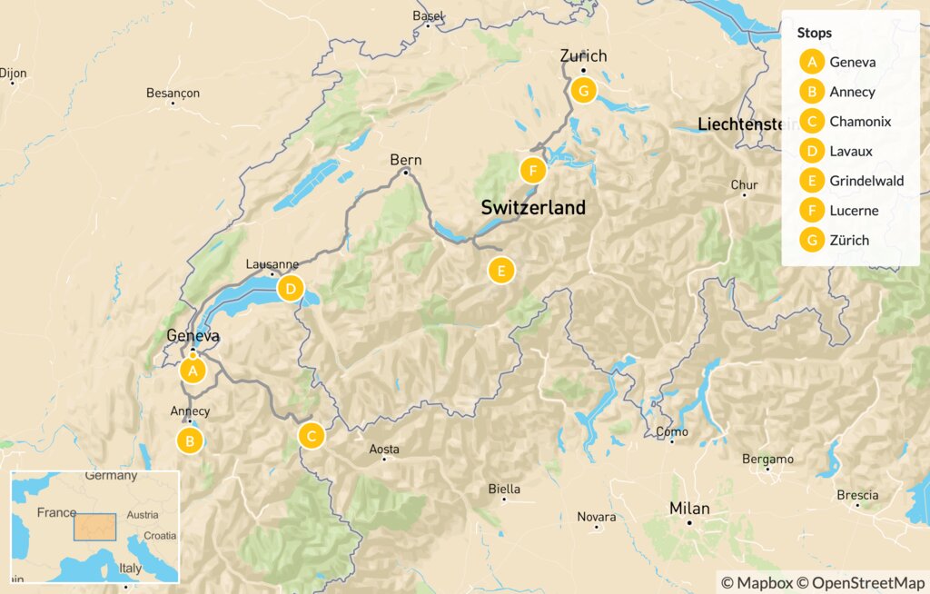 Map of Luxury Winter Tour of France & Switzerland – 14 Days