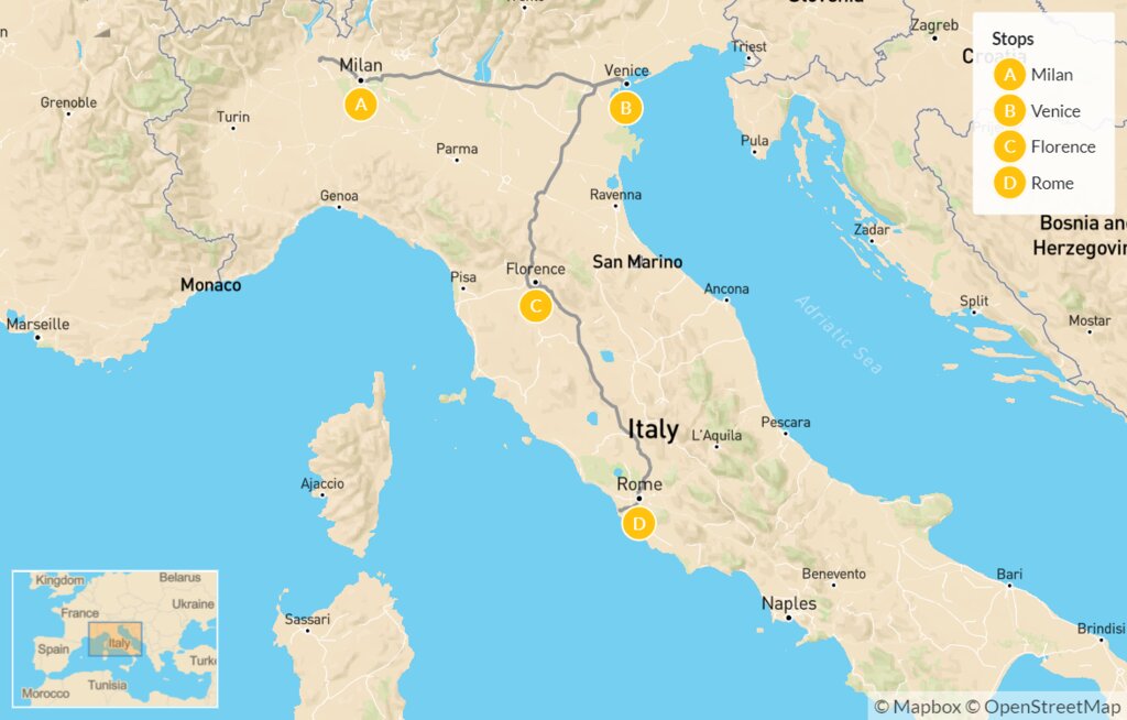 Map of Made in Italy: Explore Italian Craftmanship in Milan, Venice, Florence & Rome – 9 Days