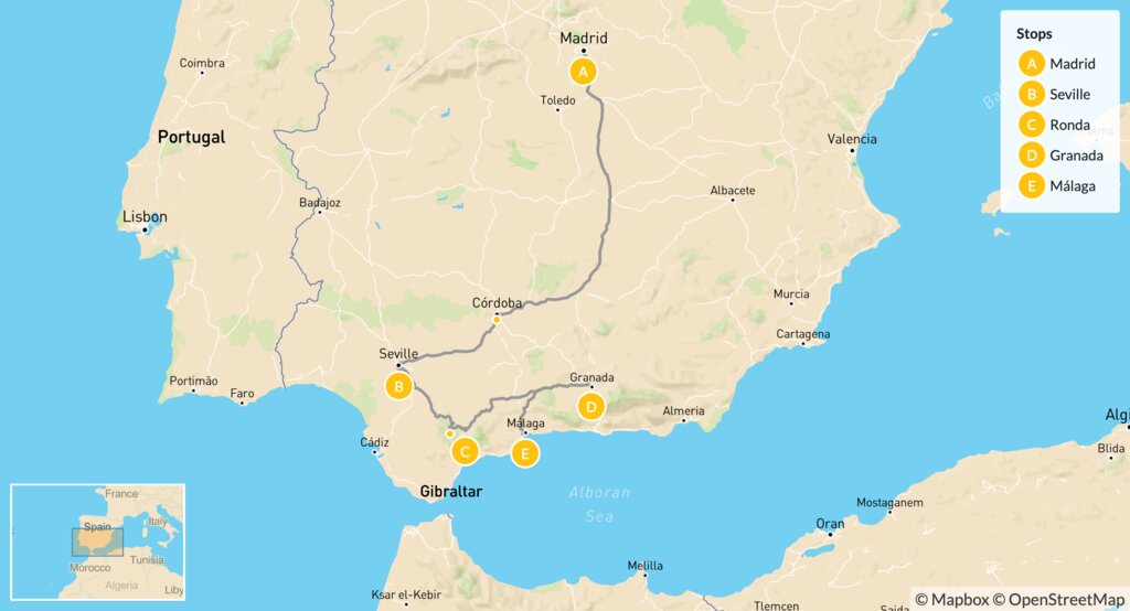 Map of Madrid & Andalusia: Seville, Ronda, Granada & Malaga – 14 Days