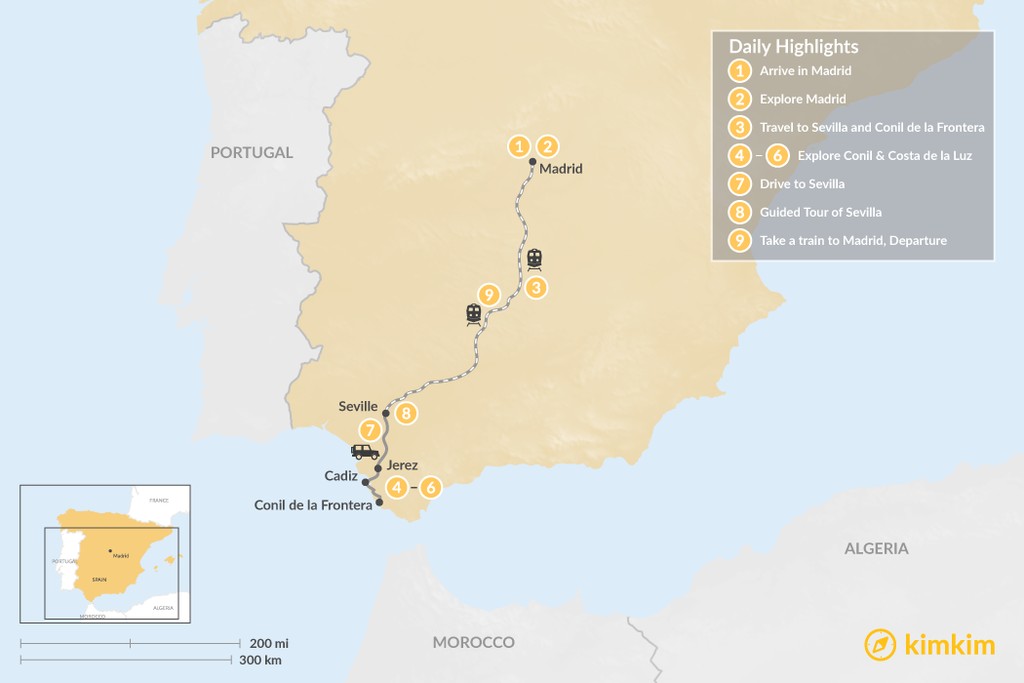 Map of Madrid, Costa de la Luz & Seville – 9 Days