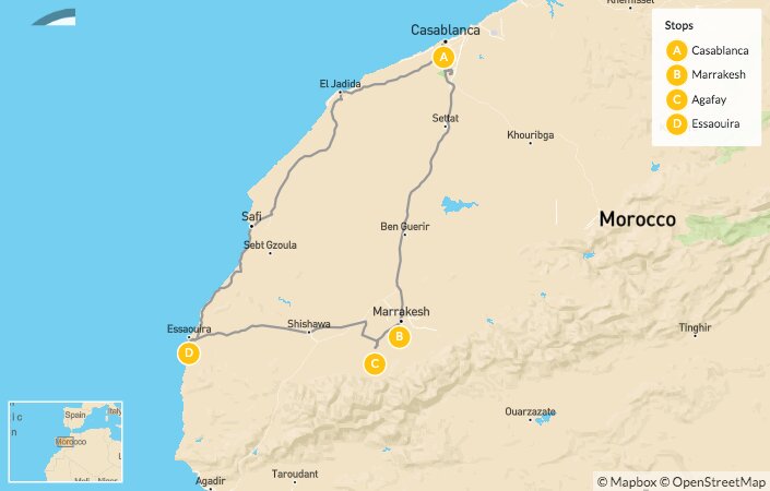 Map of Magic in Morocco: Casablanca, Marrakesh, Agafay & Essaouira – 15 Days