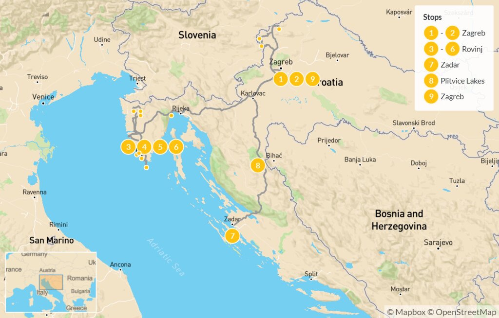Map of Magical Istria: Zagreb, Rovinj, Zadar & Plitvice Lakes – 10 Days
