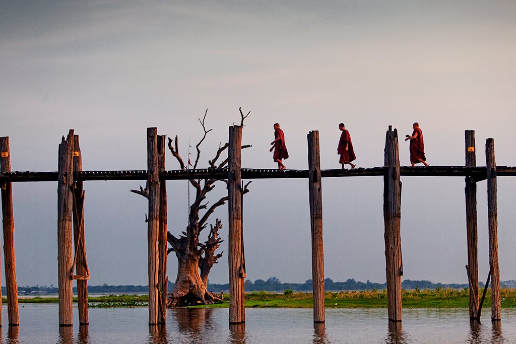 In the afternoon, head to Amarapura, the “City of Immortality”. First, visit a silk weaving workshop, then stop by Mahagandayon Monastery, home to more than 1,000 young monks dedicated to strict study and discipline. Catch the sunset while strolling on the U Bein Bridge, the world’s longest teakwood bridge spanning 1.2km across the Taungthaman Lake. After a day of nonstop new sights, head back to Mandalay at night.